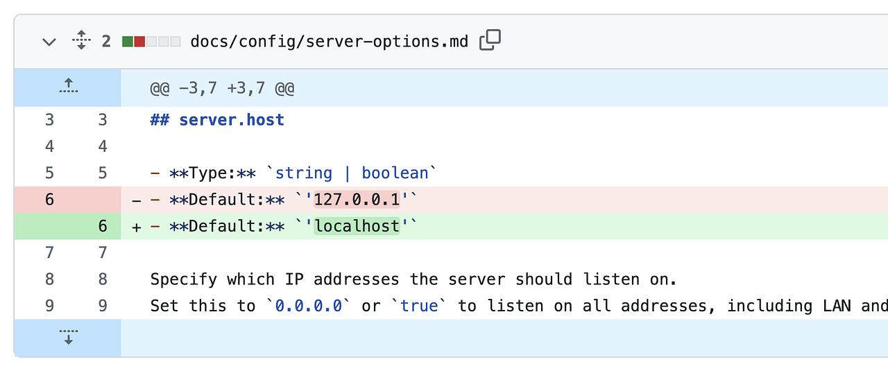 然後在 2022 年丟出來的這個 Issue,社群發現 Vite 在 Node.js 17+ 環境下會出問題。因為 Vite 強制使用 127.0.0.1,但其他工具(例如透過 net.connect() 連接 localhost)可能會解析到 ::1,導致連線失敗。所以在這個 PR,也就是我開頭提到的那個 commit,把預設的 host 改回使用 localhost。